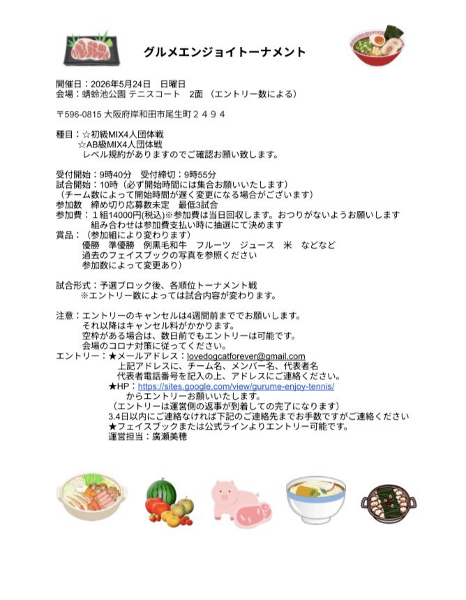 豪華賞品!黒毛和牛!? 初級ミックス4人団体戦 グルメエンジョイテニストーナメント