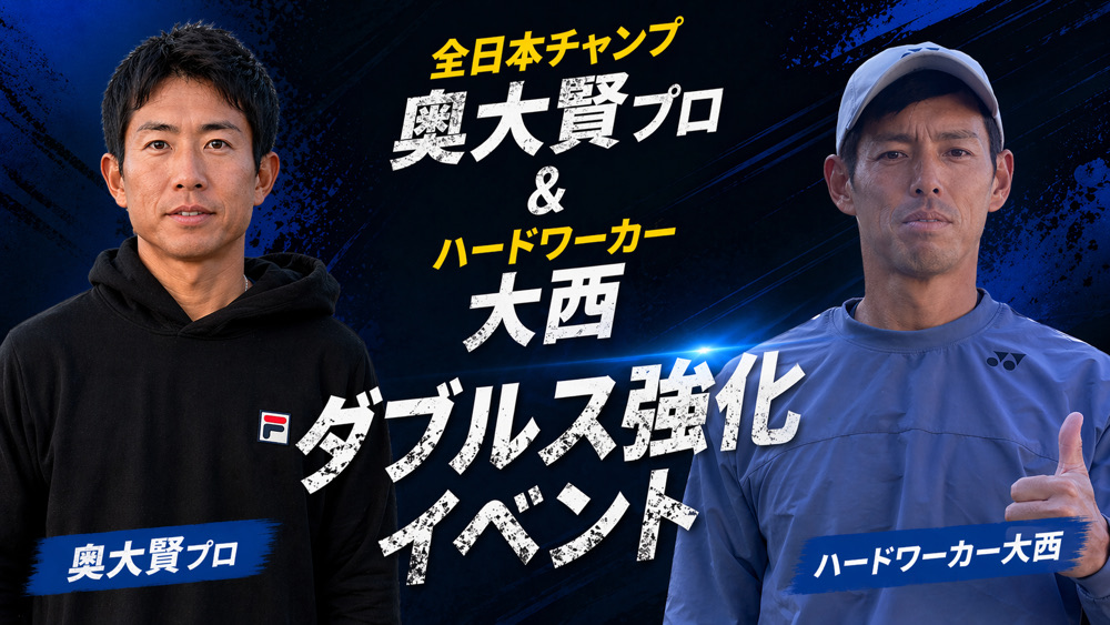 全日本チャンピオン奥大賢プロと一緒に、ダブルスで勝つための技術・戦術を学べる特別イベントです。