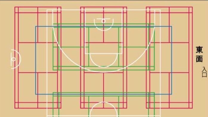 あと2~3面で開催の場合、コートから壁までの距離が近いので本格的な試合は行うことが出来ません。(画像の赤いライン使用)