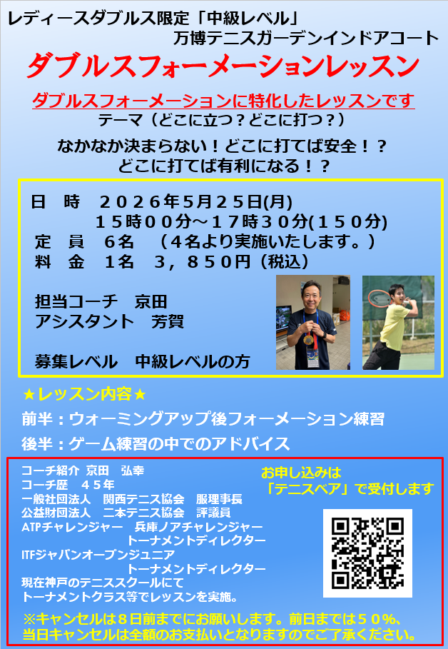 【レッスン内容】前半ウォーミングアップ後にフォーメーション練習、後半は実際にゲームをしている中でのアドバイスをさせていただきます。