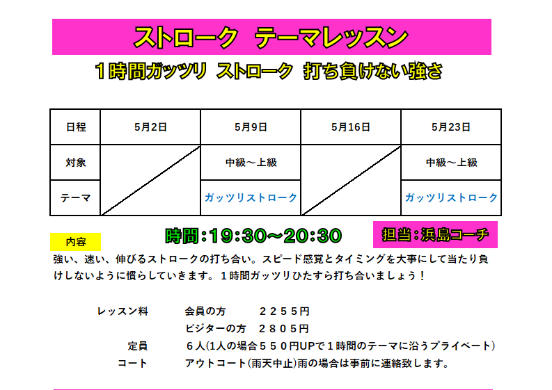 ●テーマ内容:強い、速い、伸びるストロークの打ち合い。スピード感覚とタイミングを大事にして当たり負けしないように慣らしていきます。1時間ガッツリひたすら打ち合いましょう!