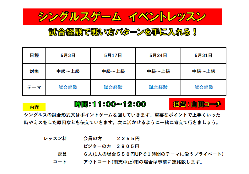 日曜日 シングルスゲーム イベントレッスン 全日本ベテラン出場コーチが担当