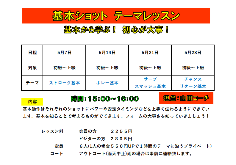 ●テーマ内容:基本動作はそれぞれのショットにパワーや安定タイミングなどを上手く伝わるようにできています。基本を知ることで考えるものがでてきます。フォームの大事さを知っていきましょう!