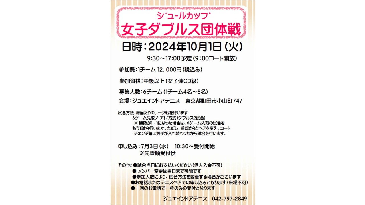 ※当日遅れる場合や、キャンセル連絡は042-797-2849 ジュエインドアテニスまでお願いします