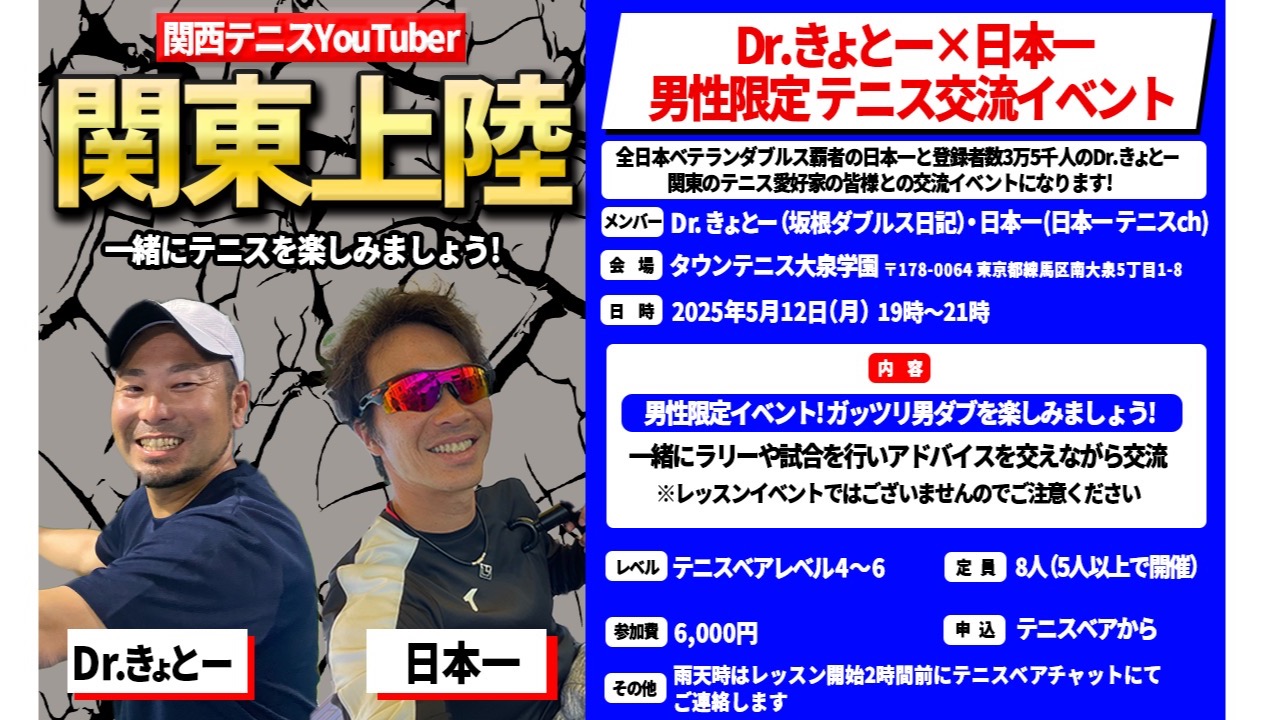 東京都にある【タウンテニス大泉学園】にて、Dr.きょとー✖️日本一による【男子ダブルス】を行います!1面8人のガッツリ男ダブ!